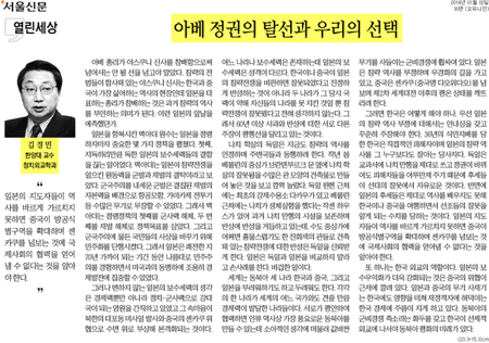 1월 2일자 <서울신문>에는 아베 총리의 야스쿠니 신사 참배에 대한 기고글이 실렸습니다. 김경민 정치외교학과 교수는 "야스쿠니 신사는 한국과 중국이 가장 싫어하는 역사의 현장인데 일본을 대표하는 총리가 참배하는 것은 과거 침략의 역사를 부인하는 의미가 된다"고 비판했는데요. 한국이 취해야 할 태도에 대해서는 "일본의 침략 역사 부정에 대해서 인내심을 갖고 꾸준히 주장해야 한다"고 말했습니다. 또한 "동북아의 군비 경쟁 축소라는 화두를 갖고 한국이 선제적으로 외교에 나서야 동북아 평화의 미래가 있다"고 조언했습니다.