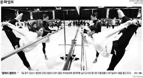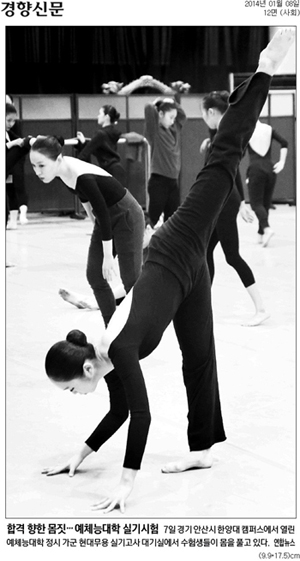대학가에는 14년도 정시 실기고사 전형이 한창인데요. 7일과 9일, 한양대에서도 2014년 예체능대학 실기 시험이 진행됐습니다. 이 날 대기실에서 떨린 마음을 안고 실기고사를 준비하는 수험생들의 모습이 8, 9, 10일자 <조선일보>, <경향신문>, <문화일보>, <연합뉴스>, <뉴시스>, <뉴스1>을 통해서 전해졌네요.