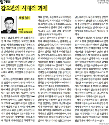1월 9일자 <한겨레>에는 이도흠 국문학과 교수의 '새해의 시대적 과제는 무엇인가'에 대한 기고글이 실렸습니다. 이 교수는 첫째로 정치민주화에 경제민주화를 종합하는 일이라고 했는데요. 둘째는 민주주의를 민주화하는 것, 셋째로는 분단모순을 극복하고 한반도 및 동아시아 평화체제를 수립하는 것이라고 말했습니다. 하지만 이 교수는 현 정권이 시대 흐름과 반대로 가고 있다며 “대통령을 비롯한 현 정권의 지도층은 시대의식을 가지고 잘 통찰하길 바란다”고 전했습니다.