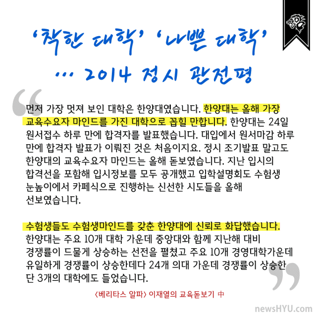 | 먼저 가장 멋져 보인 대학은 한양대였습니다. 한양대는 올해 가장 교육수요자 마인드를 가진 대학으로 꼽힐 만합니다. 한양대는 24일 원서접수 하루 만에 합격자를 발표했습니다. 대입에서 원서마감 하루 만에 합격자 발표가 이뤄진 것은 처음이지요. 정시 조기발표 말고도 한양대의 교육수요자 마인드는 올해 돋보였습니다. 지난 입시의 합격선을 포함해 입시정보를 모두 공개했고 입학설명회도 수험생 눈높이에서 카페식으로 진행하는 신선한 시도들을 올해 선보였습니다. 수험생들도 수험생마인드를 갖춘 한양대에 신뢰로 화답했습니다. 한양대는 주요 10개 대학 가운데 중앙대와 함께 지난해 대비 경쟁률이 드물게 상승하는 선전을 펼쳤고 주요 10개 경영대학가운데 유일하게 경쟁률이 상승한데다 24개 의대 가운데 경쟁률이 상승한 단 3개의 대학에도 들었습니다. <베리타스알파> 기사 전문 보기 http://www.veritas-a.com/news/articleView.html?idxno=19671 |