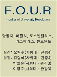 국제협력실이 주관하는 국제 프론티어 모집공고가 난 후, 팀을 짜고 기획서를 쓰면서 우리는 F.O.U.R이라는 팀명을 가지고 미국 명문대학의 홍보전략 연구를 주제로 삼았다. 당시에는 모든 것이 일사천리로 진행됐고 앞으로 우리에게 닥칠 어려움은 그다지 큰 문제가 될 것 같지 않았다. 약간의 억척스러움만 가지고 우리의 취지와 상황을 설명하면 미국이라는 머나먼 이국 땅에서도 탐방의 진행이 순조로우리라 생각한 것이다. 하지만 샌프란시스코 공항에 첫발을 들여놓으며 우리를 엄습한 것은 이번 탐방이 결코 녹록치만은 않을 것이라는 불안감이었다.