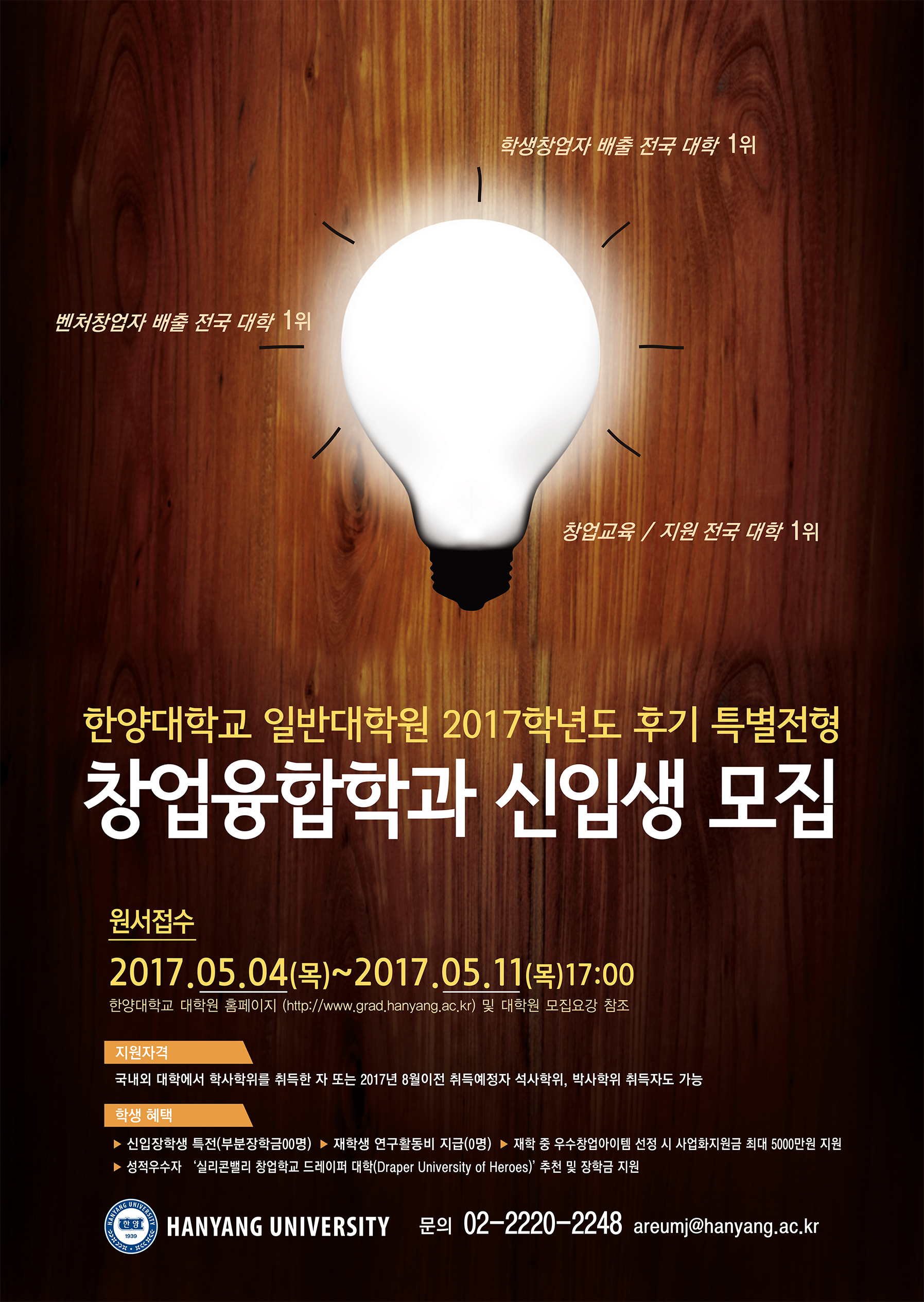 한편 한양대는 대학에 기술창업 플랫폼을 구축하고 유망한 초기창업자를 발굴해 창업 전 단계를 지원하는 2017년 창업선도대학 육성사업 주관대학으로 지난 3월 선정됐다.
