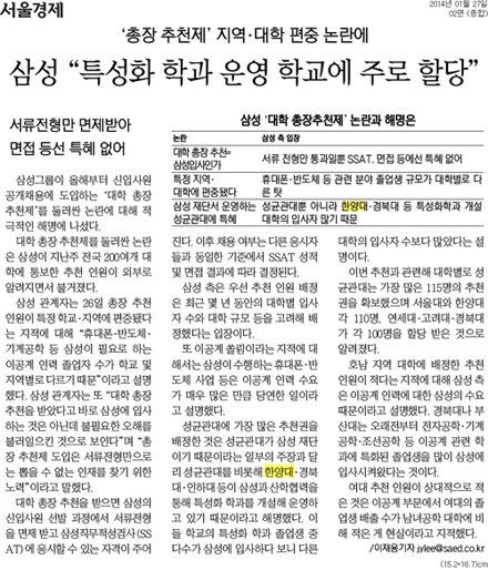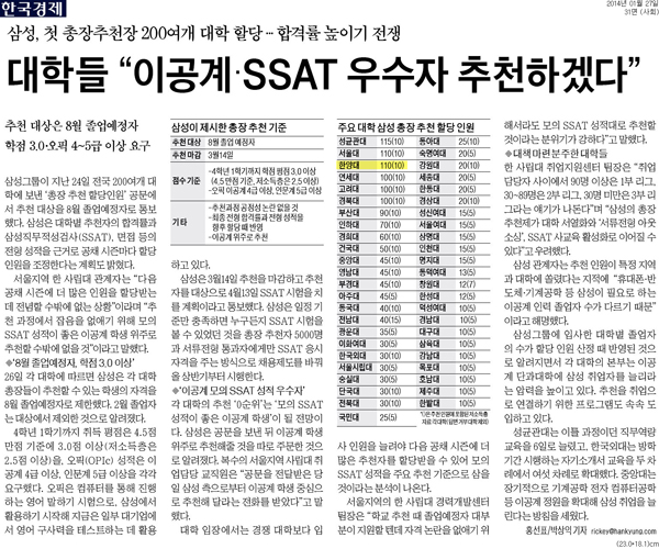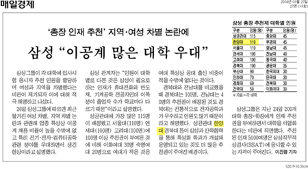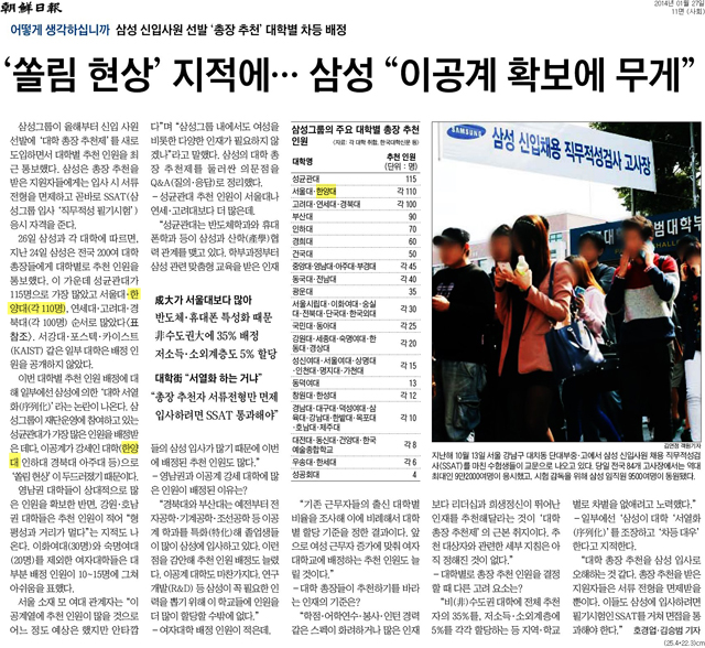 또한 <한국경제>는 삼성이 공채 시즌마다 할당 인원을 조정하겠다고 밝힌 데 대한 대학들의 반응을 전했는데요. 대학들은 더 많은 인원을 할당받기 위해 추천과정에서 SSAT우수자, 이공계 학생을 중심으로 추천할 수밖에 없을 것이라고 밝혔습니다.