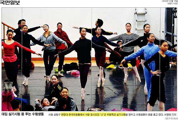 지난 14일, 한양대 한국무용홀에서는 2014년 무용학과 실기 시험이 진행됐습니다. 수험생들은 대기실에서 발레 동작을 연습하는 등 긴장을 풀기 위해 노력하는 모습을 보였는데요. 이러한 무용학과 수험생들의 생생한 모습이 15일자 <중앙일보>, <국민일보> 를 통해서 전해졌네요.