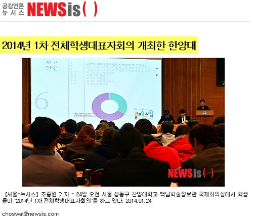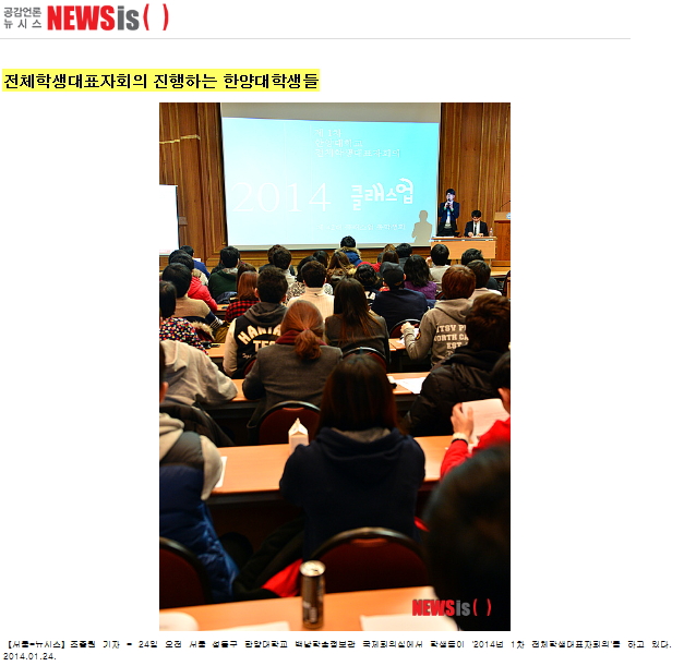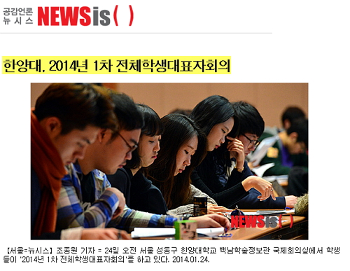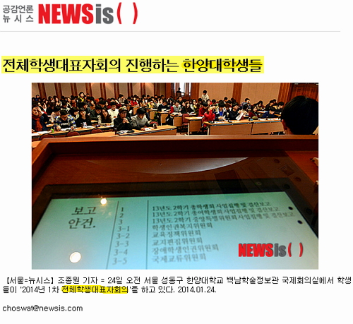 24일 오전 한양대 백남학술정보관 국제회의실에서는 학생들이 '2014년 1차 전체학생대표자회의'를 진행했습니다. 학생회 '클래스업'과 참가 학생들이 진지하게 회의에 임하는 회의장면은 <뉴시스> 포토뉴스를 통해 다양하게 전해졌네요.