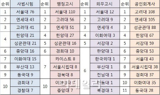 행정고시에서는 서울대(100명), 고려대(44명), 연세대(40명), 한양대(14명), 성균관대(9명), 경희대(8명) 순으로 나타났다.