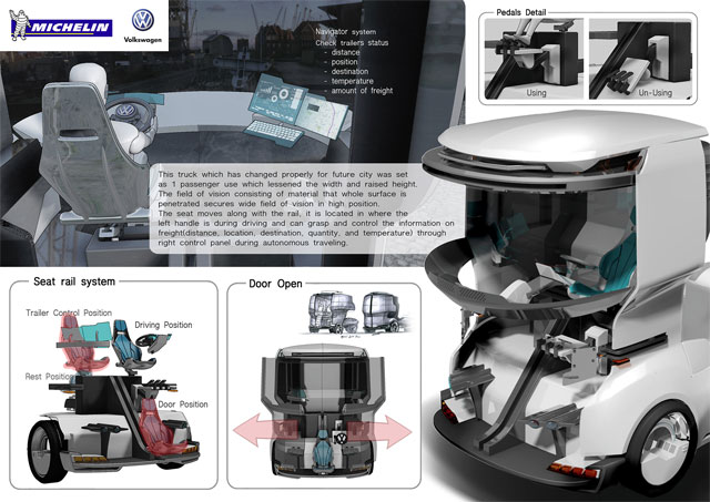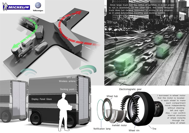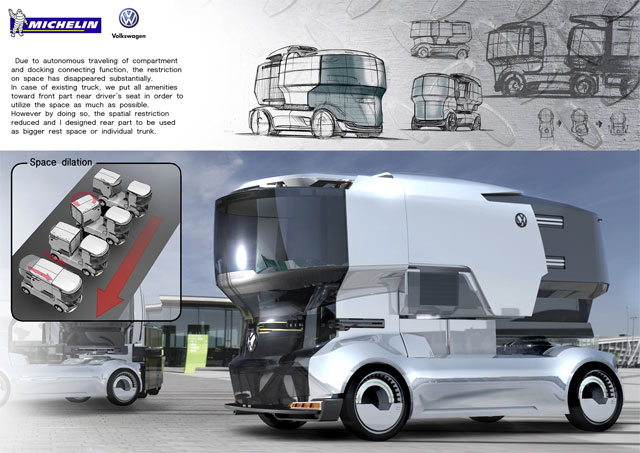 운송기기 디자인을 공부 중인 허탁범 학생은 '개랭크 콘셉트카'라는 콘셉트 트레일러트럭을 출품했다. 교통이 혼잡한 구간에서 트럭이 트레일러를 직접 견인하지 않고 개별적인 차량으로 분할돼 움직이는 것이 특징이다.