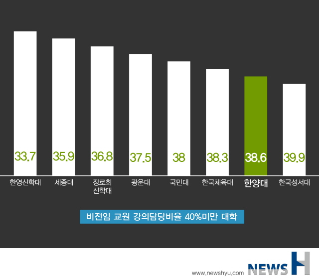 지난해 38개 4년제 대학들의 비전임 교원이 담당하는 강의 비율은 46.6%에 달하는 것으로 나타났으며, 한양대는 이 중 38.6%로 비전임 교원 강의 담당비율이 비교적 적은 학교로 분석됐다.
