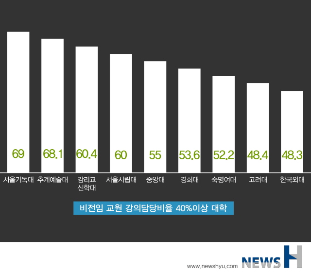 비전임 교원의 강의담당비율은 서울기독대(69%), 추계예술대(68.1%), 감리교신학대(60.4%), 서울시립대(60%) 등이 특히 높은 비율의 학교에 해당했다. 중앙대(55%), 경희대(53.6%), 숙명여대(52.2%), 고려대(48.4%), 한국외대(48.3%) 의 주요대학도 40%가 넘는 비교적 높은 비율로 나타났다.