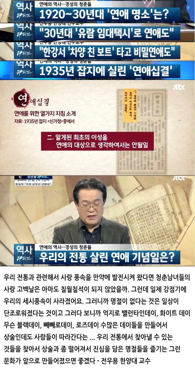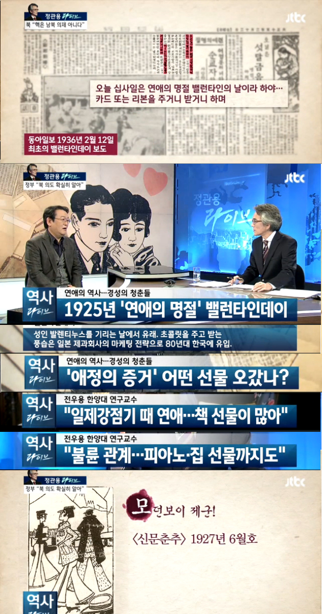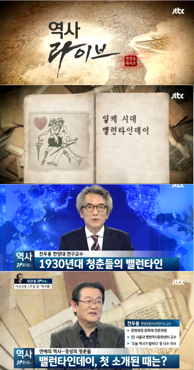 13일. 한양대학교 동아시아연구소 전우용 교수가 jtbc 전관용 라이브에 출연했다. 방송은 사회적으로 주목받고 있는 '밸런타인데이'에 맞춰 1930년대 당시의 풍속과 함께 우리나라의 연애 기념일에 대한 역사적 내용들을 조망하면서 다양한 이야기를 풀어냈다.