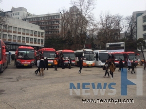 | ▲ 17일. 한양대학교 학생들이 오리엔테이션을 참석하기 위해 버스에 탑승하고 있다. | ||