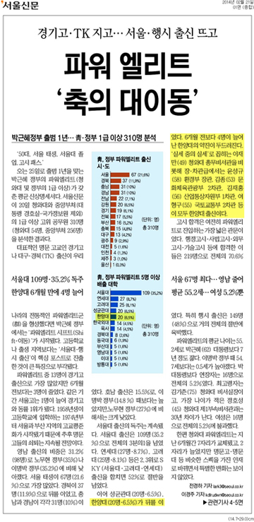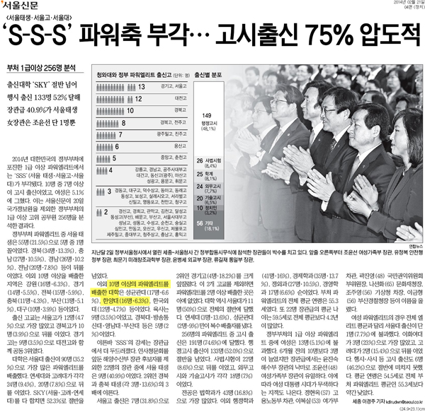 <서울신문>이 2014년 대한민국의 정부부처에 포진한 1급 이상 파워 엘리트 310명을 분석한 결과를 발표했습니다. 분석에 따르면 S-S-S, 즉 서울 태생, 서울고 졸업, 서울대생이 파워축으로 부각되었는데요. 한양대는 파워 엘리트를 20명 배출해 국내 대학 중 4위를 기록하는 성과를 보였습니다. 특히 16명이었던 한양대 출신 파워 엘리트는 6개월 사이 4명이 늘어나 다른 학교에 비해 빠른 약진으로 주목을 받았습니다.