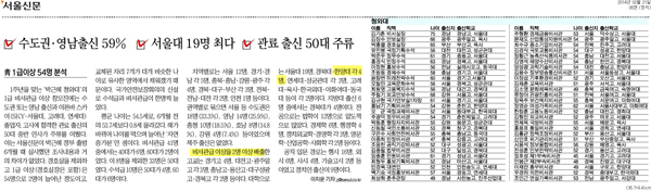 <서울신문>은 또한 '박근혜 청와대'의 1급 비서관급 이상 참모진 54명을 분석했는데요. 한양대는 그 중 4명을 배출하여 서울대에 이어 2번째로 많은 동문이 활동하고 있는 것으로 나타났네요.