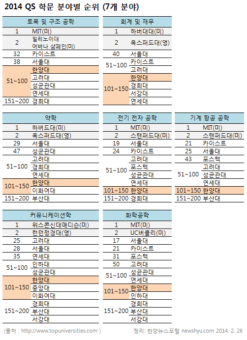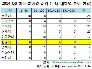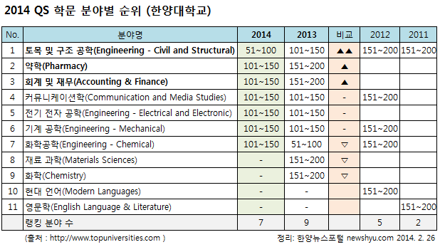 | ▲ 2014 QS 학문 분야별 순위. 한양대 전년도 비교표 | ||