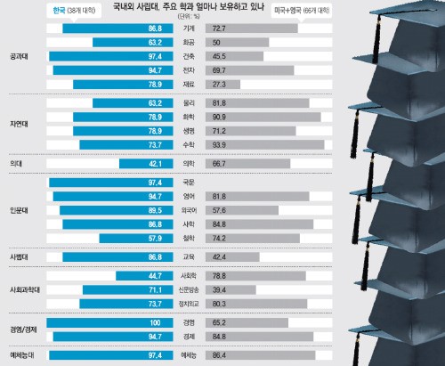 | ▲ 국내외 사립대, 주요 학과 얼마나 보유하고 있나 (이미지 출처 : 동아일보 3월 3일자 [사립대 95%에 영어 관련학과… 철학 등 기초학문은 취약]) |