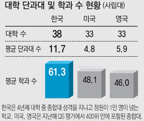 국내 사립대는 평균 61.3개 학과를 보유해 미국(48.1개), 영국(46개)의 사립대 평균 학과 수보다 10개 이상 많았다. 그에 비해 국내 국공립대는 평균 77.5개로 미국 국공립대에 해당하는 주립대 평균 80.5보다 적었다.
