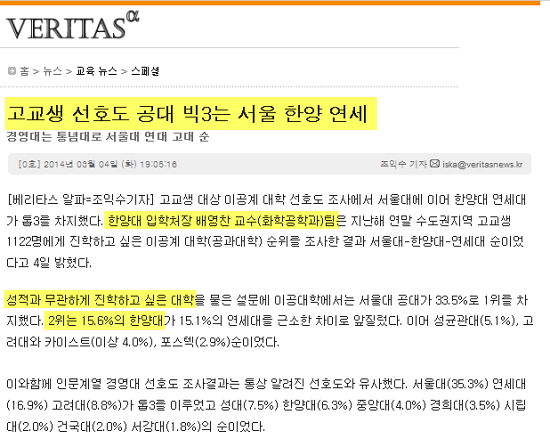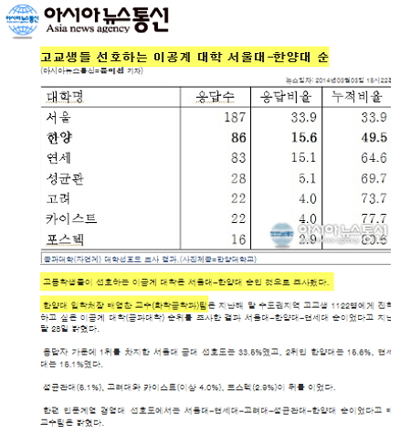 고등학생들을 대상으로 진행한 공과대학 선호도 순위 조사에서 서울대와 한양대, 연세대가 '톱 3'를 차지했습니다. 한양대 입학처 배영찬 입학처장은 지난 3일 이같은 조사 결과를 발표했는데요. 수도권 지역 고교 1~3학년 1122명을 대상으로 '성적에 관계없이 진학하고 싶은 이공계 대학 선호도'를 조사한 결과 △서울대(187명) △한양대(86명) △연세대(83명) △성균관대(28명) △고려대(22명) △카이스트(22명) △포스텍(16명) 순으로 집계됐다고 밝혔습니다. 이같은 조사결과는 4일자 온라인 뉴스 <아시아뉴스통신>, <베리타스알파>, <이데일리>를 통해 전해졌습니다.