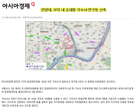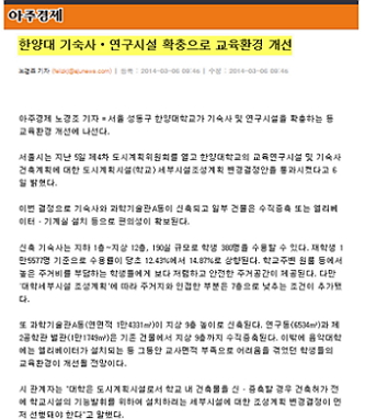 한양대에 190실 규모의 기숙사가 들어서고 연구동 3곳이 신·증축될 예정이라고 합니다. 서울시는 지난 6일 제 4차 도시계획위원회를 열고 이같은 내용의 교육연구시설 및 기숙사 건축계획에 대한 결정안을 통과시켰다고 밝혔는데요. 이번 결정으로 기숙사가 신축되고 일부 건물은 수직증축 또는 엘리베이터 설치 등으로 편의성이 확보될 것이라고 하네요. 신·증축 건물에 대한 좀더 자세한 사항은 7일자 <문화일보>, 온라인매체 <아시아경제>, <아주경제>, <뉴시스>, <연합뉴스>, <이투데이> 등을 통해 확인하실 수 있습니다.
