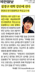 영화배우 설경구 씨가 이달부터 예술체육대학 연극영화학과 특임 교수로 강단에 섭니다. 앞으로 1년 동안 전공 수업인 '현장실습1'을 맡아 영화 촬영 기법이나 배우의 자세 등에 대해 가르친다고 하는데요. 설 씨의 이같은 임용 관련 소식이 11일자 <서울신문>, <동아일보>, <국민일보>, <경향신문> 등 다양한 매체를 통해 전해졌습니다.