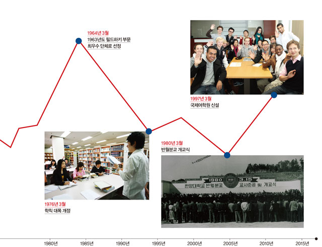 한양대학교는 1979년에 제2캠퍼스 반월분교를 설치 후 1980년대에 들어서서 안정적인 서울·안산 캠퍼스 체제를 구축했다. 반월대학(1982년 반월캠퍼스로 개명, 1987년 안산캠퍼스로 개명)의 설립으로 외형적 규모의 팽창과 함께 질적 성장을 이루며 대학의 지평이 확대되었다. 반월분교의 교사 준공식과 개교식이 거행된 건 1980년 3월 15일이었다. 전년도 5월 17일 첫 삽질을 시작한 지 10개월 만에 드디어 광활한 대지 위에 웅대한 무대가 그 모습을 드러낸 것이다. 이후 서해안고속도로의 톨게이트가 바로 본 캠퍼스에 인접하게 만들어졌다. 서해안 시대에 그 중심체 역할을 다할 지점에 자리 잡고 뿌리를 내리게 되었다는 의미에서 개교식을 겸한 교사 준공식은 한양대학교의 새로운 도약을 예고하는 역사적 순간이었다.