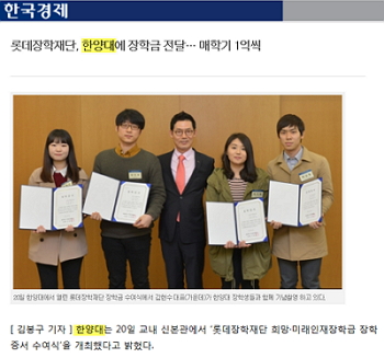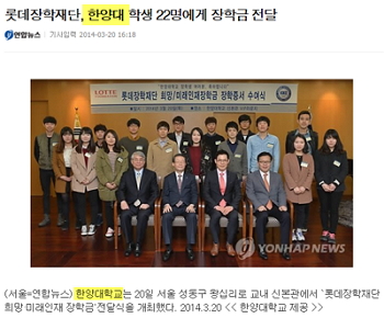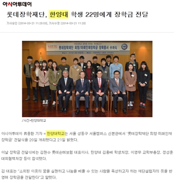 지난 20일 교내 신본관에서는 ‘롯데장학재단 희망·미래인재장학금 장학증서 수여식’이 열렸습니다. 이날 롯데장학재단은 한양대생 22명에게 장학금을 전달했는데요. 재단은 앞으로도 매 학기 한양대 학생들에게 1억 원 내외의 장학금을 지급할 예정이라고 합니다. 이같은 장학증서 수여식 소식은 21일자 온라인뉴스 <한국경제>,<연합뉴스>, <아시아투데이>를 통해 전해졌습니다.