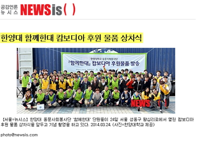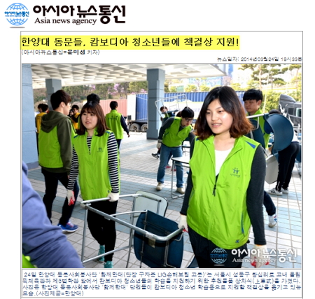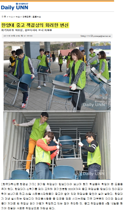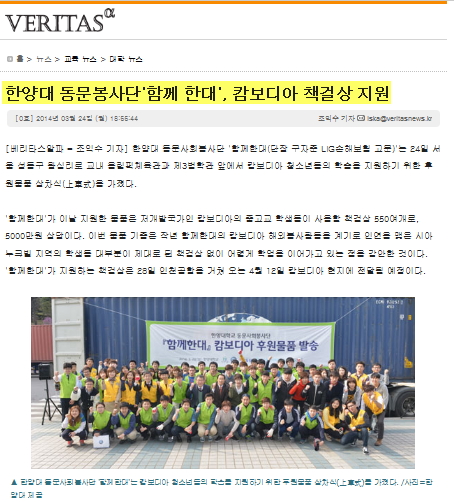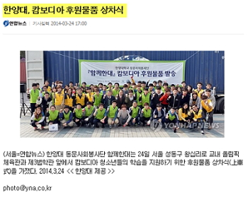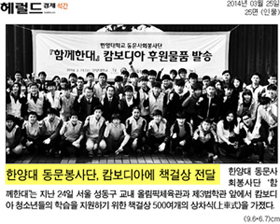 한양대 동문사회봉사단 '함께한대'는 지난 24일 캄보디아 청소년들의 학습을 지원하기 위한 후원물품 상차식(上車式)을 가졌습니다. 이날 지원한 물품은 저개발국가인 캄보디아의 중고교 학생들이 사용할 책걸상 550여개라고 하는데요. 책걸상을 옮기는 '함께한대'의 활동 모습이 26일자 <헤럴드경제>, 25일자 온라인매체 <연합뉴스>, <베리타스알파>, <한국대학신문>, <뉴시스>, <뉴스1>, <아시아뉴스통신>를 통해 전해졌습니다.
