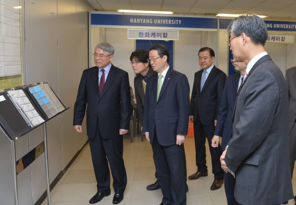 | ▲ 이영무 한양인재개발원장(왼쪽에서 세 번째)이 ‘한양인재개발원’ 조직에 대한 설명을 듣고 있다. | ||