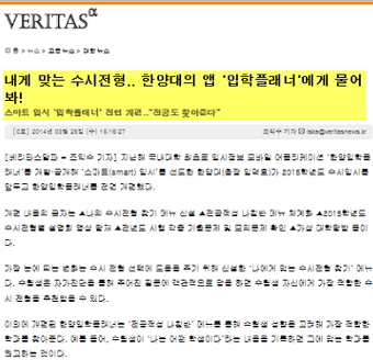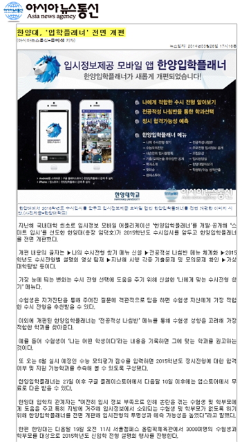 지난해 국내대학 최초로 입시정보 모바일 어플리케이션 ‘한양입학플래너’를 공개해 ‘스마트 입시’를 선도한 한양대가 2015학년도 수시입시를 앞두고 한양입학플래너를 전면 개편했습니다. 개편 내용의 골자는 △나의 수시전형 찾기 메뉴 △전공적성 나침반 메뉴 체계화 △2015학년도 수시전형별 설명회 영상 탑재 △지난해 시행 각종 기출문제 및 모의문제 확인 등인데요. 편하고 유용해진 '한양입학플래너'에 대한 자세한 소식이 26일자 온라인매체 <아시아뉴스통신>, <베리타스알파>, <뉴스1>을 통해 전해졌습니다.
