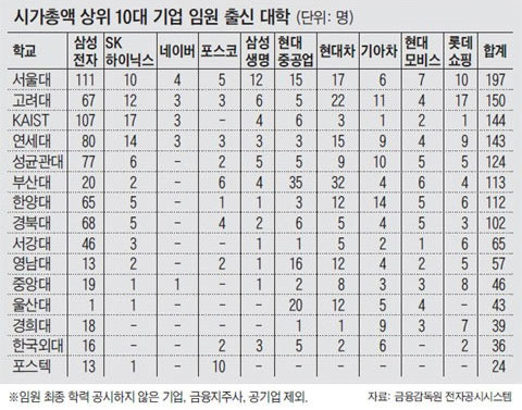 | ▲ 시가총액 상위 10대 기업 임원 출신 대학(단위:명) 그래프 출처 : 조선일보 2014-04-02 "'별들의 고향' 이공계" |