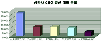 지난 8월말, 한국상장사협의회(회장 박승복)가 6백 76개 상장사의 대표이사 6백 15명을 대상으로 출신 대학을 조사한 결과 본교가 서울대(27.2%), 연세대(11.1%), 고려대(11%)에 이어 4위(9.6%)를 차지하고 있는 것으로 나타났다. 특히 서울대와 고려대 출신 대표이사의 비율은 전년에 비해 각각 0.6퍼센트, 0.4퍼센트씩 줄어든 반면, 본교 출신의 대표이사 비율은 오히려 1.2퍼센트가 오르는 흥미로운 분석이 제시됐다.