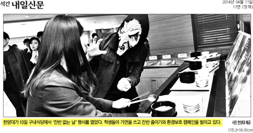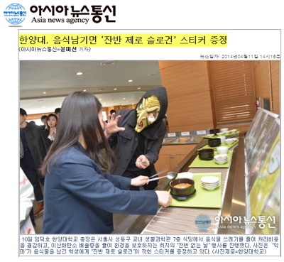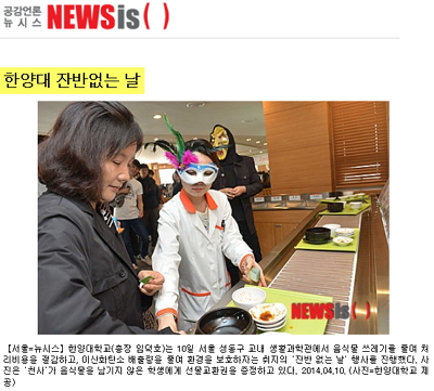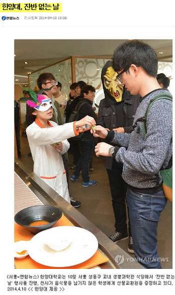 지난 10일 교내 생활과학관에서는 음식물 쓰레기를 줄여 처리비용을 절감하고, 이산화탄소 배출량을 줄여 환경을 보호하자는 취지의 ‘잔반 없는 날’ 행사를 진행했는데요. '천사'와 '악마'까지 등장하는 행사의 생생한 모습이 12일자 <내일신문> 외 온라인매체 <연합뉴스>, <뉴시스>, <아시아뉴스통신> 등을 통해 전해졌습니다.