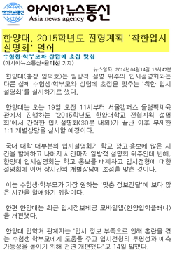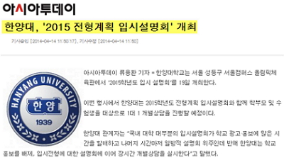 오는 19일에는 '2015학년도 한양대학교 착한 입시설명회'가 열립니다. 이번 설명회의 특징은 간략한 입시설명이 끝난 이후 무제한 1:1 개별상담을 실시할 예정이라는 것인데요. 이는 수험생·학부모가 가장 원하는 '맞춤 정보전달'에 보다 많은 시간을 할애하기 위해서라고 합니다. 이 소식은 16일자 <내일신문>, <아시아뉴스통신>, <아시아투데이>, <뉴스1>, <이데일리>와 18일자 <베리타스알파> 등을 통해 전해졌습니다.