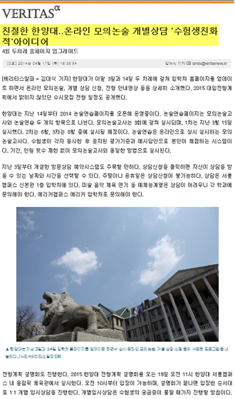 특히 18일자 <베리타스알파>에서는 이달 3일과 14일 두 차례에 걸쳐 업데이트된 입학처 홈페이지에 대한 소식도 함께 전했는데요. 이제 한양대 입학처 홈페이지에서는 온라인 모의논술, 개별 상담 신청, 전형 안내영상 등 수험생을 배려한 다양한 프로그램을 만나볼 수 있다고 합니다.