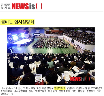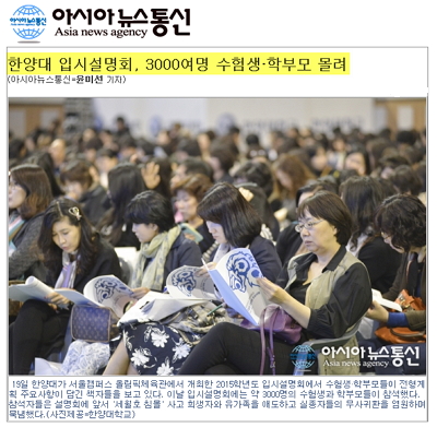 지난 19일 한양대 올림픽체육관에서는 2015학년도 입시설명회가 열렸습니다. 3000여 명의 수험생과 학부모들이 참석한 가운데 열린 설명회에서는 전형계획뿐 아니라 '무제한' 1:1 개별상담 시간도 가졌는데요. 설명회가 진행되는 생생한 현장 소식이 19일자 <아시아뉴스통신>, <뉴시스>, <뉴스1> 등을 통해 전해졌습니다.