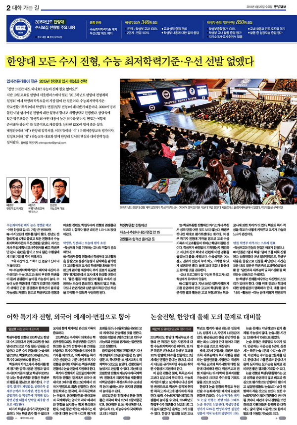 23일자 <중앙일보>에는 2015년도 한양대 수시모집에 대한 특집 기사가 게재되었습니다. 배영찬 입학처장 외 입시전문가들이 달라진 한양대 입시의 핵심과 전형별 대비전략 등을 짚어본 것인데요. 특히2015학년도 한양대 입시의 특징인 수능최저학력기준 · 학교생활기록부 · 면접(일부 전형)이 폐지된 데 대한 내용을 중심으로 알아보았습니다.