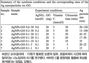 아울러 허 교수는 초음파처리를 통해 나노입자의 크기를 조절하는 방법을 제안했다. 나노입자의 크기와 형태가 중요한 이유는 그에 따라 그래핀 합성물의 효율성이 달라지기 때문. 허 교수는 “아직은 어떤 크기의 입자가 성능을 최적화 하는지 모른다”며 “크기를 조절할 수 있다는 사실 자체가 시사점을 던져주는 것”이라고 했다. 그래핀 합성물의 성능 실험에서 나노입자의 크기와 형태가 중요한 지표가 되리라는 전망이다. 연구팀은 다양한 분석 기술(XRD, TEM, HR-TEM, SAED)을 이용해 질산은 수용액의 농도와 초음파처리 시간이 은나노입자의 크기와 형태에 미치는 영향을 분석했다. 허 교수는 “논문에서 발표한 기술이 다양한 후속 연구에 활용되기를 바란다”고 기대했다.