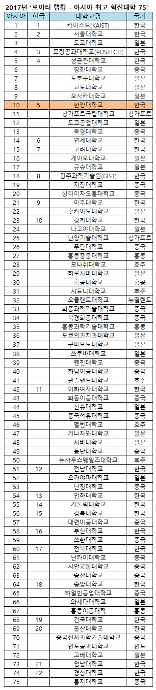 한양대는 세계 최대 뉴스 공급 업체인 로이터가 8일 발표한 ‘로이터 랭킹-아시아 최고 혁신대학 75(Reuters Top 75: Asia’s Most Innovative Universities)’에서 아시아 10위, 국내 5위를 기록했다. 이는 작년보다 아시아 순위에서 5계단, 국내 순위에서 2계단 상승한 기록이다.