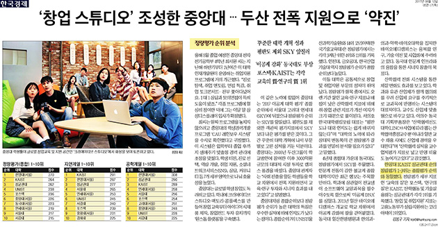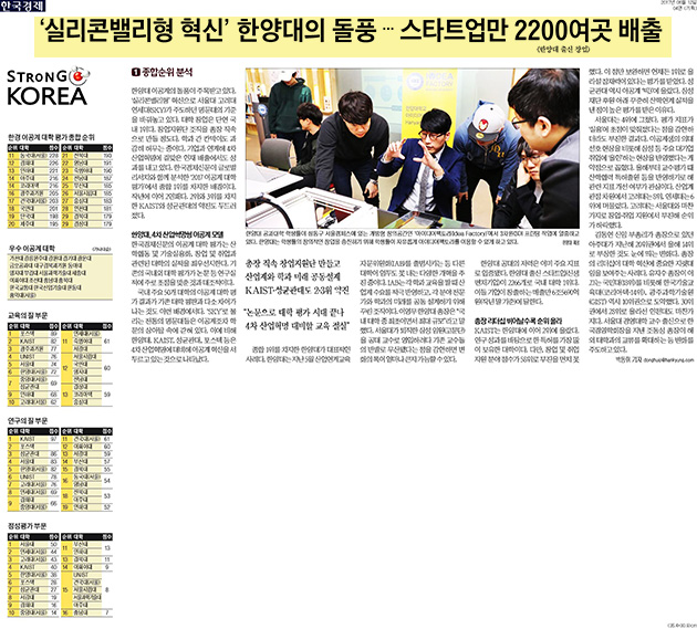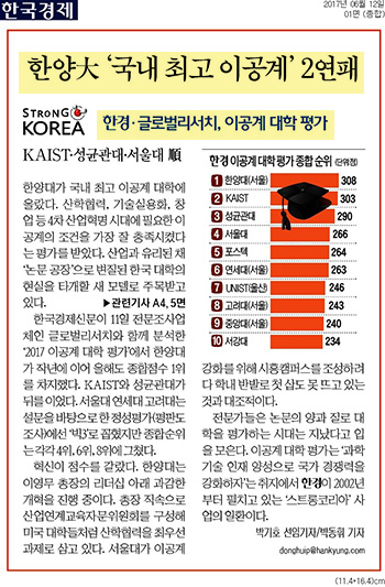 6월 12일 <한국경제>는 한양대가 국내 최고 이공계 대학에 올랐다는 내용을 전했습니다. 한국경제신문이 글로벌리서치와 함께 분석한 '2017 이공계 대학 평가'에서 한양대는 산학협력, 기술실용화, 창업 등 4차산업혁명 시대에 필요한 이공계의 조건을 가장 잘 충족시켰다는 평가를 받아 작년에 이어 올해도 종합점수 1위를 차지했습니다. 한양대는 '실리콘밸리형' 혁신으로 서울대, 고려대, 연세대가 주도하던 명문대의 기준을 바꿔놓고 있는데요. 이번 평가에서는 혁신이 점수를 갈랐다고 합니다. 한양대는 이영무 총장의 리더십 아래 과감한 개혁을 진행 중으로 지난 5월 산업연계교육자문위원회(IAB)를 출범시키는 등 다른 대학이 엄두도 못 내는 다양한 개혁을 추진중에 있습니다. 뿐만 아니라 한양대 출신 스타트업은 2266개로 국내 대학 1위를 차지하고 있으며 이들 기업이 창출하는 매출만 6조 5690억원에 달하고 있어 산업과 유리된 채 '논문 공장'으로 변질된 한국 대학의 현실을 타개할 새 모델로 주목받고 있습니다.
