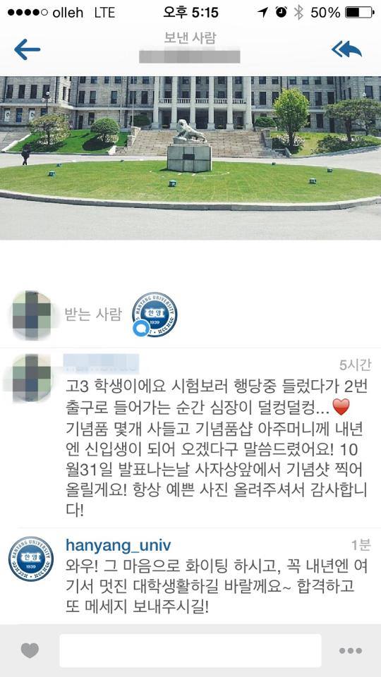 지난 주말 인스타그램 한양대 계정으로 하나의 메시지를 받았습니다. 한 수험생이 한양대 캠퍼스에 들려 기념품을 사고 가면서 꼭 합격하겠다는 각오를 사진과 함께 한양대 계정에 보낸 것이었습니다.