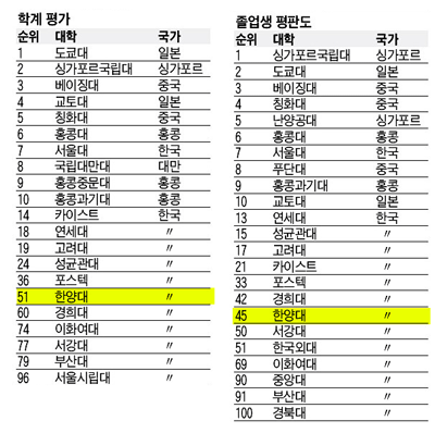 | ▲ 2014 조선일보-QS 아시아대학평가 지표별 순위 중 학계 평가와 졸업생 평판도 순위 (출처 : 조선일보 ) | ||