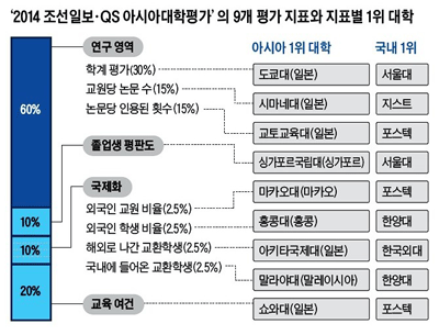 | ▲ 2014 조선일보-QS 아시아대학평가의 9개 지표와 지표별 1위 대학 (출처 : 조선일보) | ||