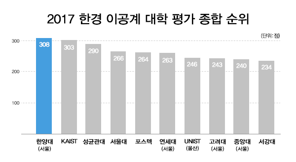 한국경제신문이 11일 글로벌리서치와 함께 분석한 ‘2017 이공계 대학 평가’에서 한양대는 산학협력, 기술실용화, 창업 등 4차 산업혁명 시대에 필요한 이공계의 조건을 가장 잘 충족시켰다는 평가를 받으며 종합점수 308점으로 작년에 이어 올해도 국내 최고 이공계 대학으로 뽑혔다. 2위는 303점을 받은 KAIST가, 3위는 290점을 받은 성균관대가 뒤를 이었다.
