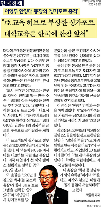 6월 7일 <한국경제>는 싱가포르 대학교 교육에 대한 이영무 총장의 인터뷰를 전했습니다. 도시 국가인 싱가포르는 인구와 자원이 한정돼 있는 만큼 소수 국립대를 집중 육성하는 전략을 추진하고 있는데요. 이 총장은 "지난달 싱가포르를 방문했는데 줄곧 추진해온 아시아 교육 허브 전략이 성공하고 있다는 점을 절감했다. 특히 MIT 학장을 지낸 인물을 총장으로 영입해 2010년께 만든 국립대 싱가포르테크놀로지&디자인대(SUTD)에 깊은 인상을 받았다. 이곳은 전통적인 학과 구분을 아예 없앴다. 강의실 벽을 TV로 채워 팀별로 만든 작품을 바로 TV에 구현하기도 하고, 작업실엔 3D 프린터가 즐비하다. 학생 중 상당수가 해외 유학생이다. 서울대도 여기와 붙으면 어떻게 될지 등골이 서늘했다"라고 말했습니다.