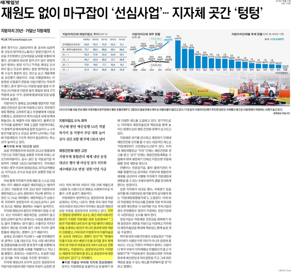 올해로 20년째를 맞은 지방자치의 재정 건전성이 갈수록 악화되고 있습니다. 이와 함께 지자체가 스스로 조달하는 재정자립도도 떨어지고 있다는데요. 주만수 경제학부 교수는 "그동안 지방재정 낭비 등이 불거질 때마다 재정낭비를 초래하는 원인이 아니라 결과에 대한 처방이 강화됐고, 이에 따라 지방정부의 지출자율성은 오히려 위축되는 경향이 있다"며 "현재의 지출구조와 세수 배분구조를 유지할 경우 현재 국세 대 지방세 비중을 8:2에서 6:4로 전환하더라도 지방정부는 중앙정부로부터 이전받는 재원에 의존해야 할 정도로 중앙정부에 대한 의존성이 깊다"고 지적했습니다.