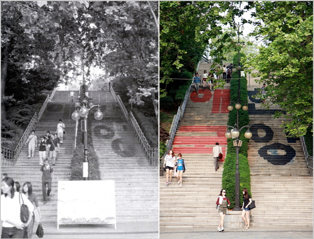 서울캠퍼스 사회대학 앞의 88계단. 왼쪽 계단에는 ‘애국’, 오른쪽 계단에는 ‘한양’이라는 글자가 쓰여있다. 오른쪽 계단으로 다니면 F학점을 받는다는 ‘전설’때문에 학생들은 왼쪽으로만 다니곤 했다. 홍보팀 원장희 과장(사회.96)은 “90년대에도 있었던 말”이라면서 “이름은 88계단이지만 88개가 아닌 이유는 폭우 등으로 파손되는 과정들이 있었기 때문”이라고 말했다. 권경복 팀장은 “80년대에는 한마당에 엄청난 인원이 모일 때가 많았다”면서 “그때 88계단이 스탠드의 역할을 하곤 했다”고 전했다.