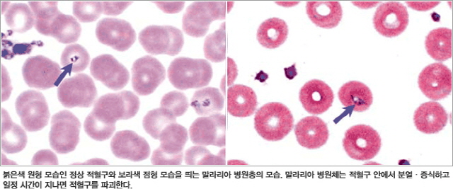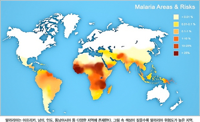 말라리아는 열원충(Plasmodium, 기생충의 일종)에 의해 발생한다. 사람에게 감염되는 열원충은 4종류다. 한국의 말라리아는 삼일열원충(Plasmodium Vivax)이다. 그 중 사람에게 가장 치명적인 열원충은 열대지역의 ‘열대열원충(Plasmodium Falciparum). 아프리카, 남미, 인도, 동남아시아 등이 열대열원충이 포진한 위험지역이다. 말라리아 병원체는 모기가 사람 피를 빨 때 인체에 침입한다. 그 후 말라리아는 적혈구 안에서 분열·증식하고 일정 시간이 지나면 적혈구를 파괴한다. 발열·오한·떨림 등의 현상은 말라리아가 적혈구를 파괴할 때 생긴다. 열대열원충이 일으키는 ‘열대열 말라리아’는 사람의 간과 심장, 심지어 뇌까지 파괴해 사망에 이르게 한다. 전체 말라리아 질병 중 80%는 열대열 말라리아일 정도로 백신 개발이 필요하다.