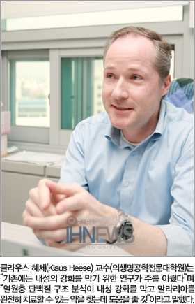 한국에서 말라리아는 ‘두렵지 않은 질병’이다. 1996년부터 매년 2천명씩 환자가 발생하지만 한국의 ‘삼일열 말라리아’는 증상이 가볍고 약으로 쉽게 치료가 가능하기 때문이다. 하지만 아프리카 등 열대지역의 ‘열대열 말라리아’는 다르다. 매년 250만 명이 감염되고 그 중 100만 명이 사망한다. 5월 이달의 연구자로 선정된 클라우스 헤세(Klaus Heese) 교수(의생명공학전문대학원)는 ‘열대열 말라리아’를 연구했다. 열대열 말라리아의 단백질 구조를 분석해 말라리아를 백신 개발의 초석을 마련한 것이다.