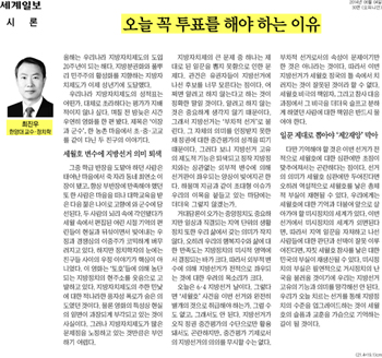 4일자 <세계일보>에는 최진우 정치외교학과 교수가 '오늘 꼭 투표를 해야 하는 이유'에 대한 기고글을 전했습니다. 최 교수는 올해 20주년을 맞는 우리나라의 지방자치제도가 아직 많은 문제점을 가지고 있다고 지적했는데요. 그는 "관건은 유권자들이 지방선거에 나선 후보를 너무 모른다는 점이다"라며 "미시정치의 부실은 필연적으로 거시정치의 난국을 불러올 것이기에 우리는 지방선거 고유의 기능과 의미를 망각해선 안 된다"고 조언했습니다.