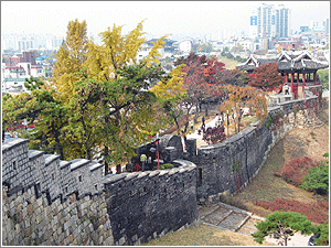 답사단이 처음 찾은 곳은 우리나라 성곽문화의 꽃이라고 불리는 수원성. 한국식 성곽의 정수이자 걸작이라는 칭송에 걸맞게 매끈하게 뻗은 성벽 사이사이에 세워진 각종 성문과 포대가 푸른 가을 하늘과 멋지게 어우러져 있었다. 수원성을 말할 때 빼놓을 수 없는 역사적 인물은 정조와 사도세자이다. 다산 정약용이 거중기를 이용해 과학적으로 축조한 것으로 유명한 이 성은 정조가 극심한 당파싸움에 시달리다 뒤주에 갇혀 8일 만에 굶어 죽었다는 아버지 사도세자의 능을 근처 화산(火山)으로 옮겨가며 만든 성이다. 성 구축과 동시에 민가를 집단 이동시켜 신도시 건설을 추진한 것이 오늘의 수원을 있게 한 시발점이라고 할 수 있다.