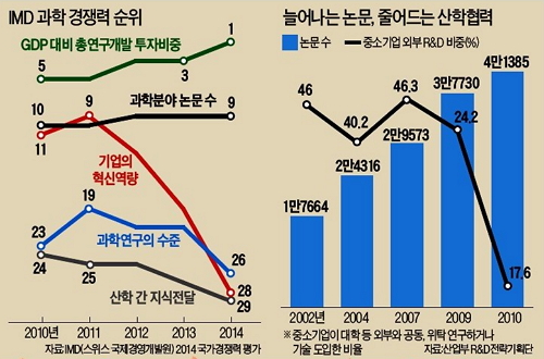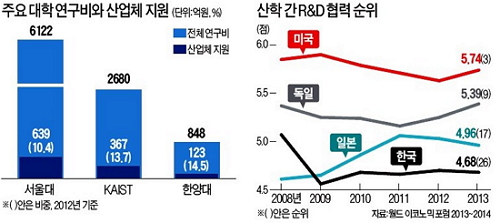 | ▲ 늘어나는 논문, 줄어드는 산학협력 (이미지 출처 : 12일자 한국경제) | ||